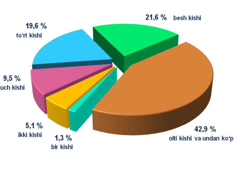 Davlat statistika qo‘mitasining uy xo‘jaliklari tanlanma kuzatuvlari 2021- yilning yanvar-sentabr holati ma’lumotlariga ko‘ra, Namangan viloyatida uy xo‘jaligi a’zolarining o‘rtacha soni 5,4 kishini tashkil etdi, shundan 1,3 % uy xo‘jaliklar bir kishilik, 5,1 % uy xo‘jaliklar ikki kishilik, 9,5 % uy xo‘jaliklar uch kishilik, 19,6 % uy xo‘jaliklar to‘rt kishilik, 21,6 % uy xo‘jaliklar besh kishilik hamda 42,9 % uy xo‘jaliklar olti kishilik va undan ko‘p kishilardan tashkil topgan.