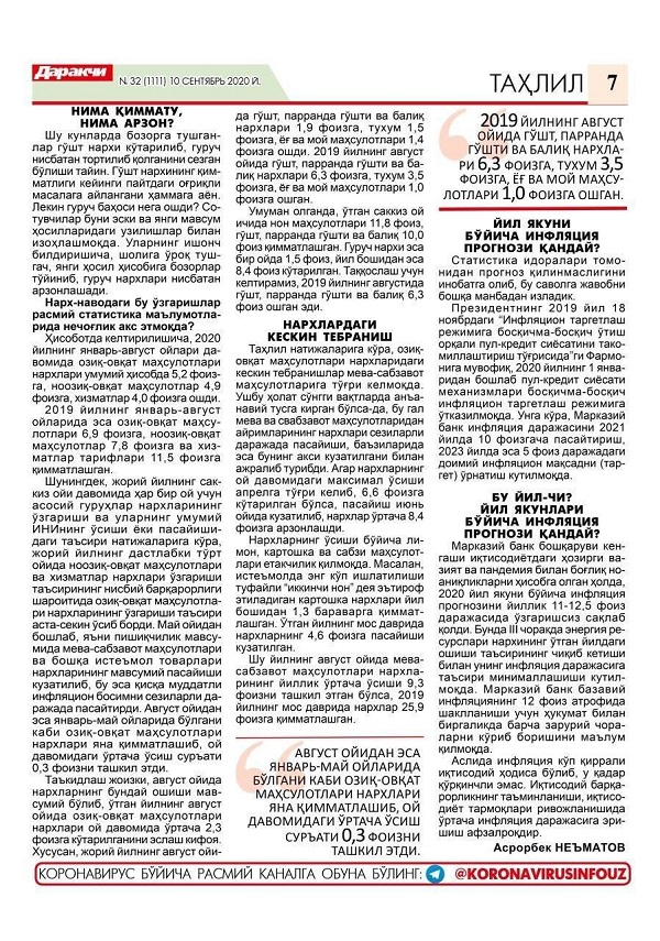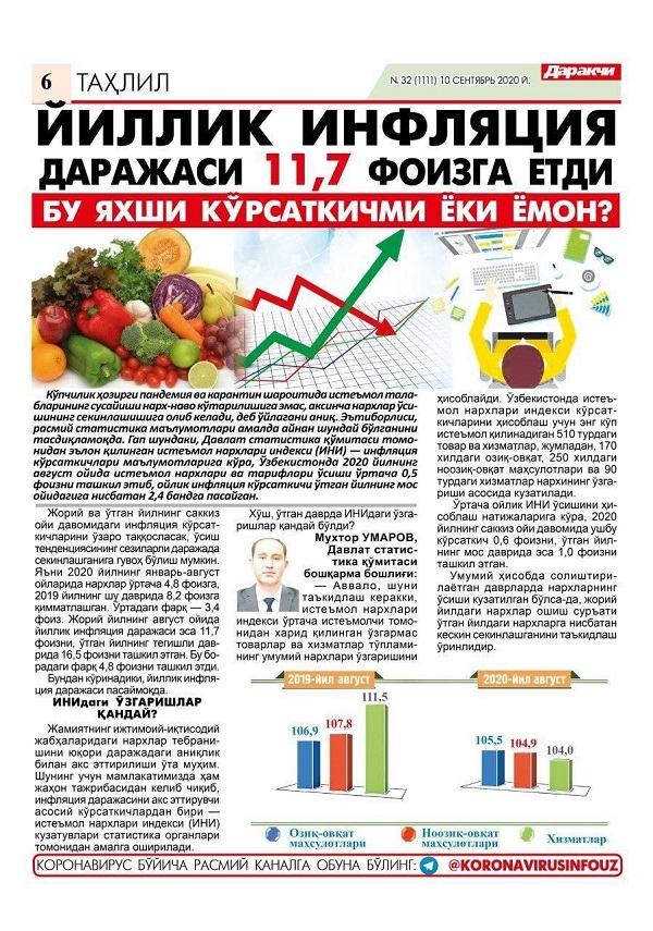 “Darakchi” gazetasining 2020- yil 10- sentabr sonida “Yillik inflyatsiya darajasi 11,7 foizga yetdi: bu yaxshi ko‘rsatkichmi yoki yomon?” nomli maqola chop etildi.