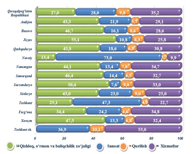 Shu bilan birga, qishloq, o‘rmon va baliqchilik xo‘jaligining YaHM tarkibidagi ulushi bo‘yicha eng kichik ko‘rsatkich Navoiy (13,4 %) va Toshkent (25,1 %) viloyatlarida, sanoatning eng kam ulushi Surxondaryo (7,6 %) va Jizzax (10,8 %) viloyatlarida, qurilishning eng kam ulushi Navoiy (3,7 %) va Toshkent (4,9 %) viloyatlarida, xizmatlar sohasining eng kam ulushi Navoiy (9,9 %) va Toshkent (22,7 %) viloyatlarida qayd etildi.
