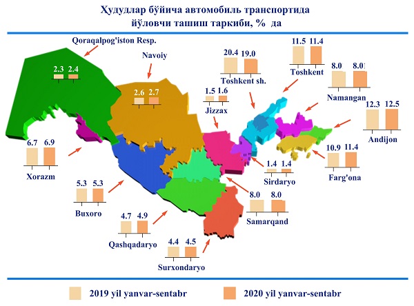 Hududlar orasida avtomobil transportida tashilgan yo'lovchilar umumiy hajmida eng yuqori ulush Toshkent shahri (19,0 %), Andijon (12,5 %), Toshkent (11,4 %) hamda Farg‘ona (11,4 %) viloyatlari hissasiga to‘g‘ri keldi.