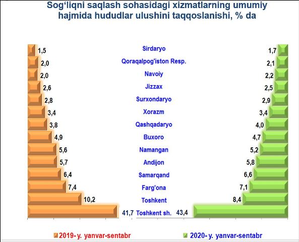 Hududlar bo’yicha taqqoslanganda, sog‘liqni saqlash sohasidagi xizmatlarning umumiy hajmida eng yuqori ulush Toshkent shahri (43,4 %), Toshkent (8,4 %), Farg’ona (7,1 %) va Samarqand (6,6 %) viloyatlari hissasiga to’g’ri keldi.