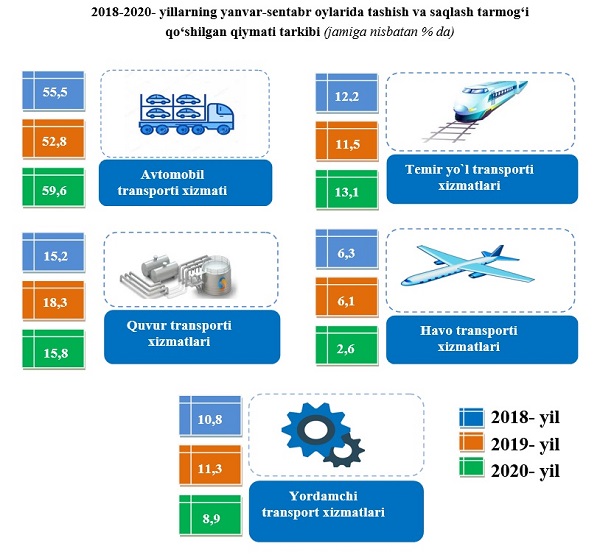 Mazkur tarmoq umumiy qo`shilgan qiymatida quvur transportining ulushi 15,8 % (2019- yilning yanvar-sentabrida - 18,3 %), temir yo`l transportining ulushi 13,1 % (2019- yilning yanvar sentabrida - 11,5 %), yordamchi transport faoliyatining ulushi 8,9 % (2019- yilning yanvar-sentabrida - 11,3 %), havo transportining ulushi 2,6 % (2019- yilning yanvar-sentabrida - 6,1 %) ni tashkil etdi.