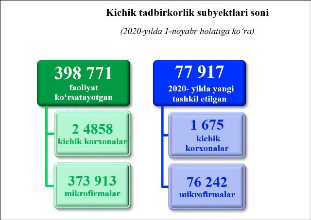 2020- yil yanvar-oktabr oylarida 77 917 ta kichik tadbirkorlik subyektlari (dehqon va fermer xoʻjaliklarisiz) yangi tashkil etilib, jami faoliyat koʻrsatayotgan kichik tadbirkorlik subyektlari soni 1- noyabr holatiga 398 771 tani tashkil etdi.