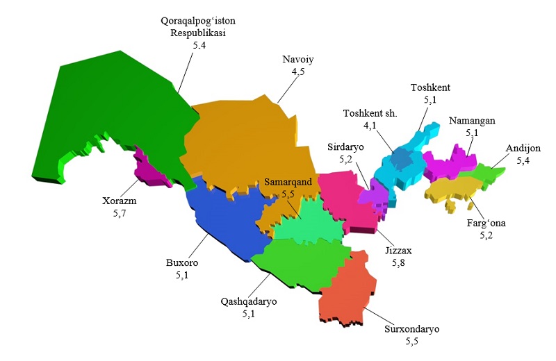 Davlat statistika qo‘mitasining ma’lumotlariga ko‘ra, 2020 yilning yanvar-sentabr holatiga, uy xo‘jaliklari tanlama kuzatuvlari ma‘lumotlariga asosan uy xo‘jaligi a’zolarining o‘rtacha soni 5,2 kishini tashkil etdi. Hududlar bo‘yicha tahlil qilganda, eng yuqori ko‘rsatkich Jizzax viloyatida (5,8 kishi), eng quyi ko‘rsatkich esa Toshkent shahrida (4,1 kishi) qayd etilganini ko‘rishimiz mumkin.