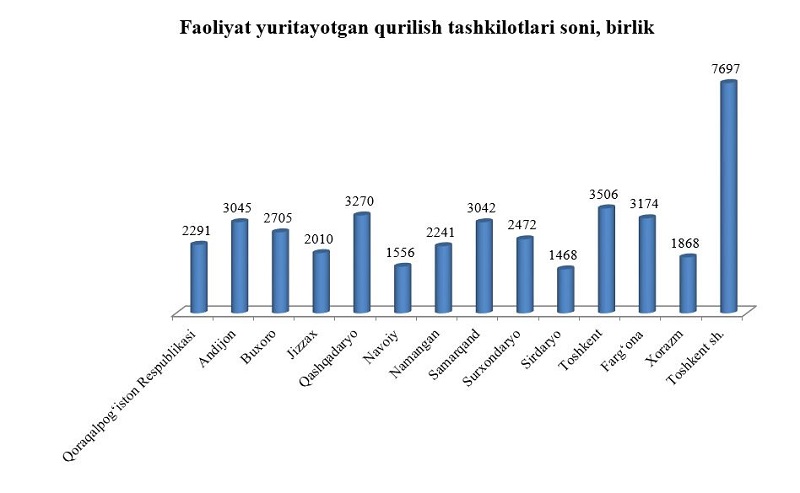 Davlat statistika qo‘mitasining ma'lumotlariga ko‘ra, joriy yilning 1- noyabr holatiga qurilish sohasida faoliyat yuritayotgan korxona va tashkilotlar soni 40,3 mingtani tashkil etib, 2019- yilning mos davriga nisbatan 6,7 % ga ko‘paydi. Ularning hududlar bo‘yicha tarkibida eng ko‘p korxonalar soni, ya'ni 7,7 mingtasi Toshkent shahridan ro‘yxatdan o‘tgan. Mazkur hududdagi bu ko‘rsatkich 2019- yilning mos davridagi ko‘rsatkichga nisbatan 17,3 % ga ko‘paydi.