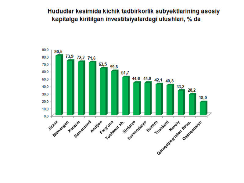 O‘zbekiston Respublikasida 2020- yilning yanvar-dekabr oylarida kichik tadbirkorlik subyektlarining asosiy kapitalga kiritilgan investitsiyalar hajmidagi ulushi 49,7 % bo‘lib, hududlar bo‘yicha eng yuqori ko‘rsatkichlarni Jizzax (80,5 %), Namangan (73,9 %), Xorazm (72,2 %), Samarqand (71,6 %) va Andijon (63,5 %) viloyatlari tashkil etdi.