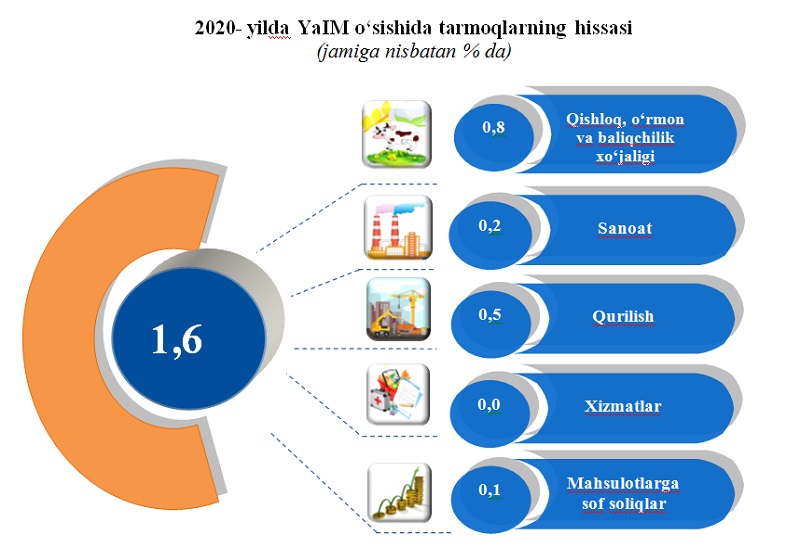 2020- yil yakunlariga ko‘ra, YaIM o‘sishiga qishloq, o‘rmon va baliqchilik xo‘jaligi tarmog‘i 0,8 f.p. (2019- yilda – 0,9 f.p.), sanoat tarmog‘i – 0,2 f.p. (2019- yilda – 1,2 f.p.) va qurilish tarmog‘i – 0,5 f.p. (2019- yilda – 1,2 f.p.) ijobiy hissa qo‘shdi.