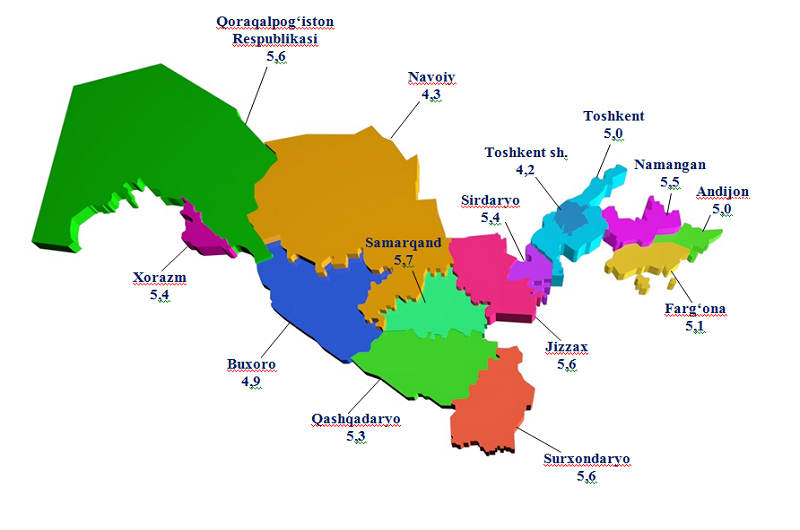 Hududlar bo‘yicha tahlil qilganda, eng yuqori ko‘rsatkich Samarqand viloyatida (5,7 kishi), eng quyi ko‘rsatkich esa Toshkent shahrida (4,2 kishi) qayd etilganini ko‘rishimiz mumkin.