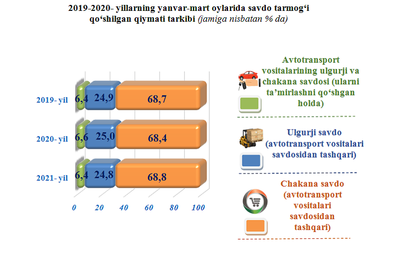 2021- yilning yanvar-martida savdo tarmog‘ining yalpi qo‘shilgan qiymati tarkibida eng katta ulush chakana savdo (avtotransport vositalari savdosidan tashqari)ga to‘g‘ri keldi va 68,8 % (2020- yil yanvar-martda – 68,4 %)ga yetdi.
