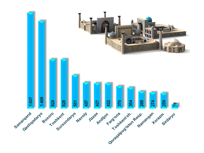 2021- yil 1- yanvar holatiga moddiy madaniy meros obyektlari soni 8208 tani tashkil etgan bo‘lib, ularning hududlar bo‘yicha taqsimlanishi quyidagicha: