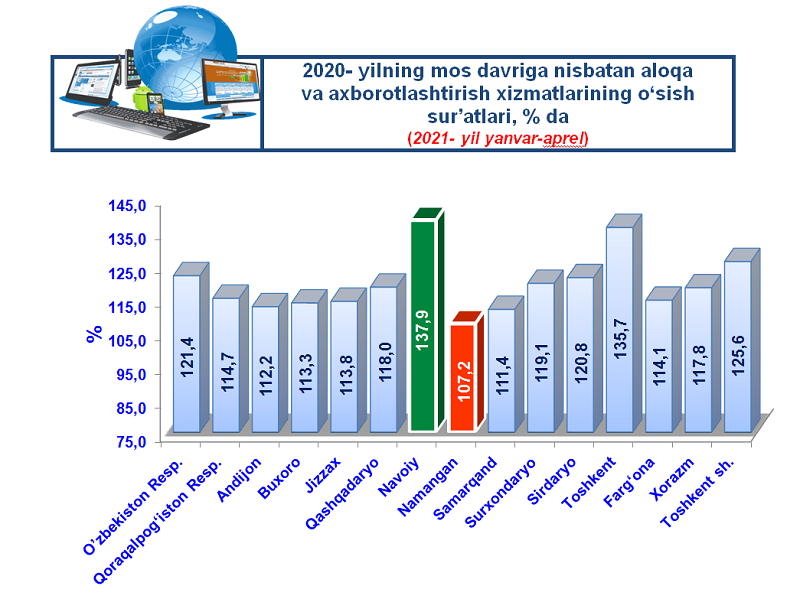 2021- yilning yanvar - aprel oyilarida ko‘rsatilgan bozor xizmatlari umumiy hajmida aloqa va axborotlashtirish xizmatlarining ulushi 5,7 % ni tashkil etib, (2020- yil yanvar-aprel oyilarida 6,0 %), o‘tgan yilning mos davriga nisbatan ushbu xizmat turining o‘sish sur’ati 121,4 % ni tashkil etdi. Ushbu sohada ko‘rsatilgan xizmatlar hajmi 4 726,4 mlrd. so‘mga ortdi.