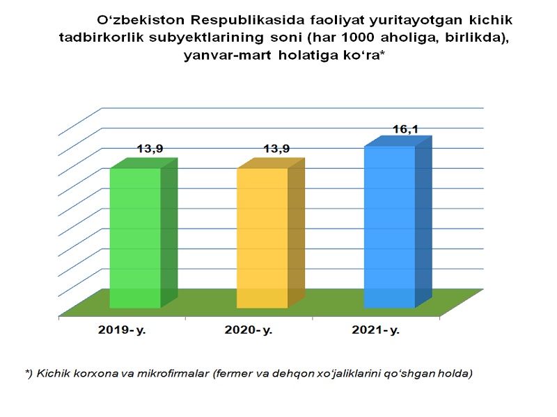 Faoliyat yuritayotgan kichik tadbirkorlik subyektlari har ming aholiga to‘g‘ri kelishi 2021- yilning yanvar-martida 16,1 birlikka yetdi. Shuningdek, hududlar bo‘yicha eng yuqori ko‘rsatkich Toshkent shahrida 32,9 birlik, Navoiy viloyatida 21,7 birlik hamda Sirdaryo viloyatida 21,6 birlikni tashkil etdi.