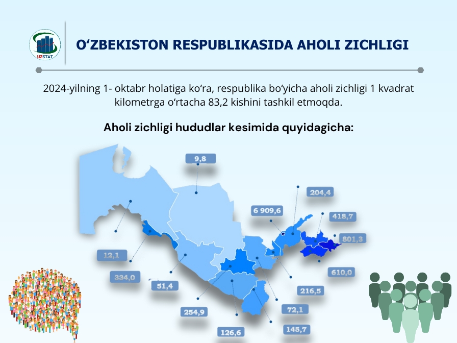 2024- yilning 1- oktabr holatiga koʻra, respublika boʻyicha aholi zichligi 1 kvadrat kilometrga oʻrtacha 83,2 kishini tashkil etmoqda.