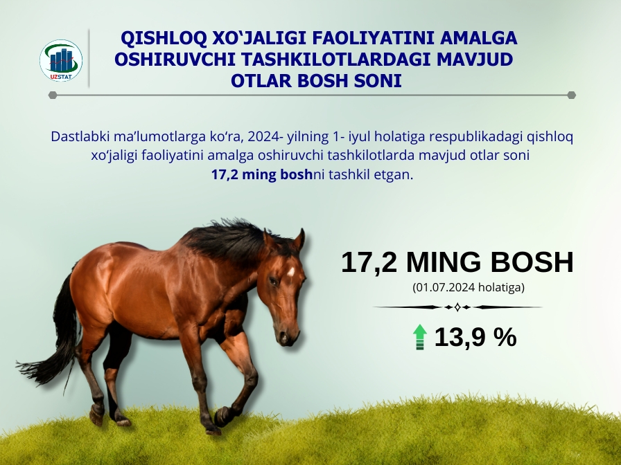 Dastlabki maʼlumotlarga koʻra, 2024- yilning 1- iyul holatiga respublikadagi qishloq xo‘jaligi faoliyatini amalga oshiruvchi tashkilotlarda mavjud otlar soni 17,2 ming boshni tashkil etgan.