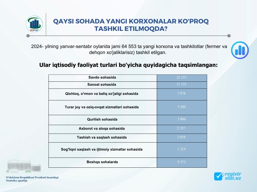 2024- yilning yanvar-sentabr oylarida jami 64 553 ta yangi korxona va tashkilotlar (fermer va dehqon xoʻjaliklarisiz) tashkil etilgan.