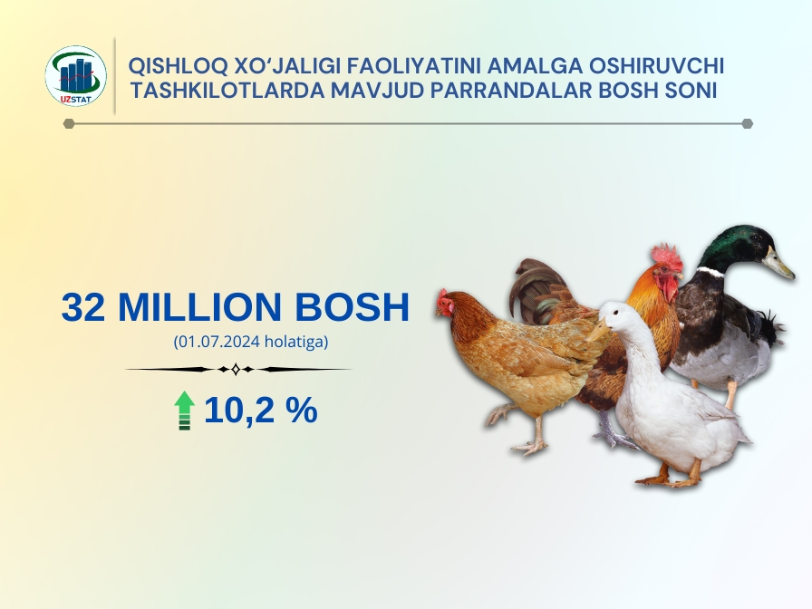 Dastlabki maʼlumotlarga koʻra, 2024- yilning 1- iyul holatiga respublikamizdagi qishloq xo‘jaligi faoliyatini amalga oshiruvchi tashkilotlarda parrandalarning umumiy soni 32 million boshga yetgan.