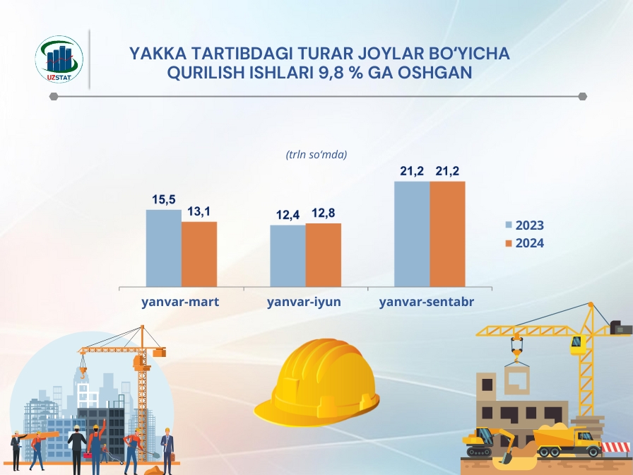 2024- yilning yanvar-sentabr oylarida Oʻzbekiston Respublikasida yakka tartibdagi turar-joylar qurilishi boʻyicha 35,4 trln soʻm ishlar bajarilgan.