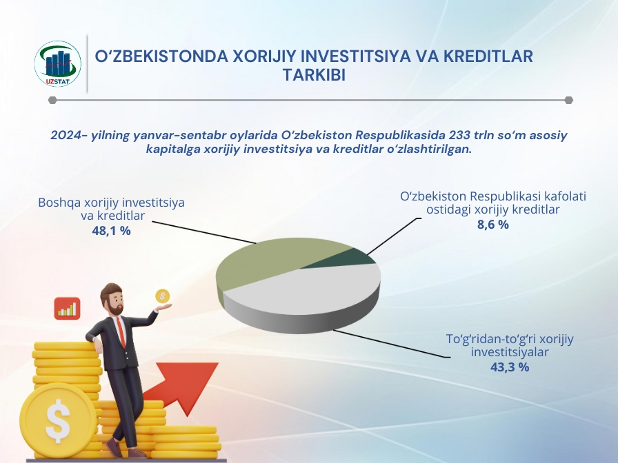 2024- yilning yanvar-sentabr oylarida O‘zbekiston Respublikasida 233 trln so‘m asosiy kapitalga xorijiy investitsiya va kreditlar o‘zlashtirilgan.