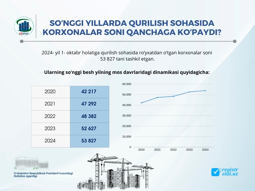 2024- yil 1- oktabr holatiga qurilish sohasida roʻyxatdan oʻtgan korxonalar soni 53 827 tani tashkil etgan.