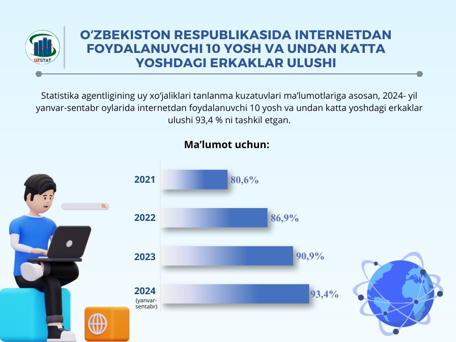 Statistika agentligining uy xo‘jaliklari tanlanma kuzatuvlari ma’lumotlariga asosan, 2024- yil yanvar-sentabr oylarida internetdan foydalanuvchi 10 yosh va undan katta yoshdagi erkaklar ulushi 93,4 % ni tashkil etgan.
