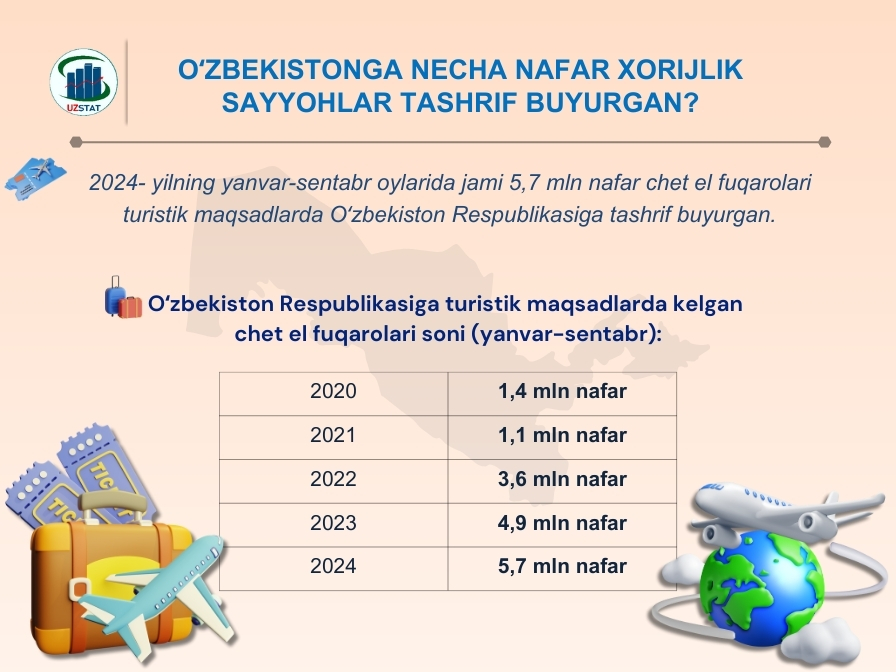 2024- yilning yanvar-sentabr oylarida jami 5,7 mln nafar chet el fuqarolari turistik maqsadlarda Oʻzbekiston Respublikasiga tashrif buyurgan.