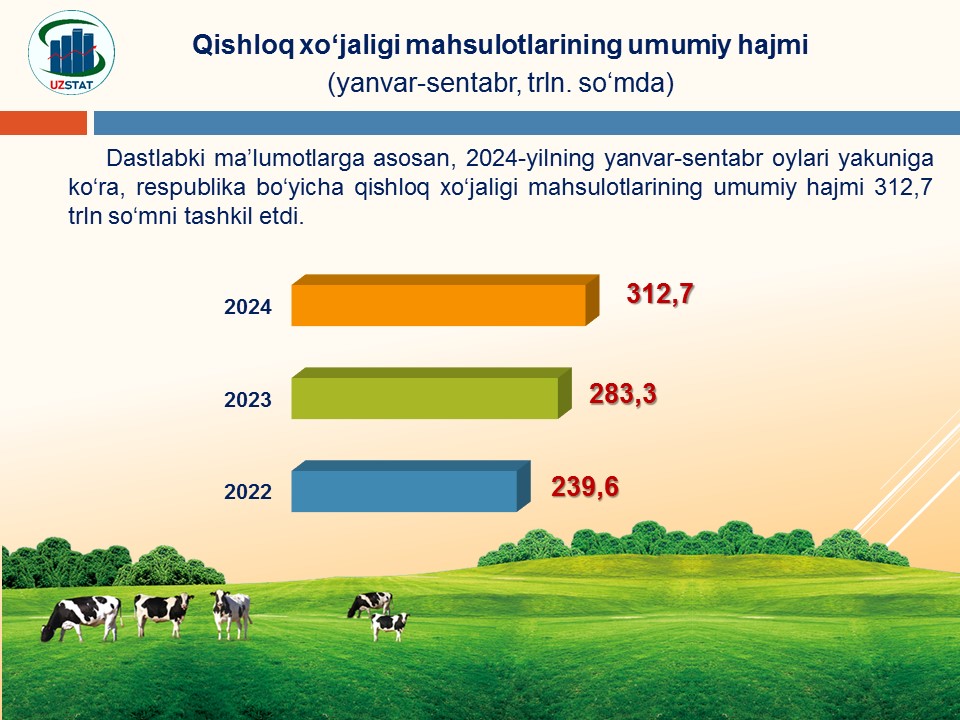 Dastlabki maʼlumotlarga asosan, 2024-yilning yanvar-sentabr oylari yakuniga koʻra, respublika boʻyicha qishloq xoʻjaligi mahsulotlarining umumiy hajmi 312,7 trln soʻmni tashkil etdi.