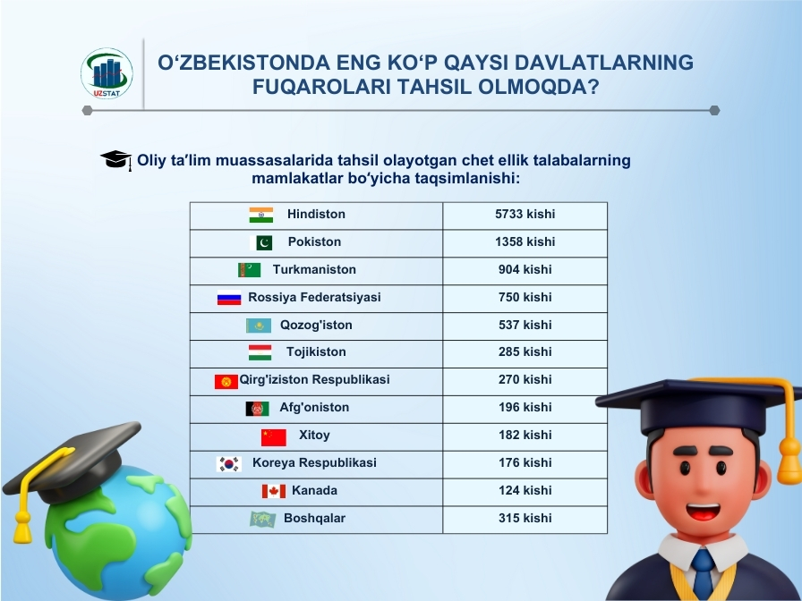 2023–2024- o‘quv yili boshiga O‘zbekiston Respublikasidagi oliy ta’lim tashkilotlarida tahsil olayotgan eng ko‘p xorijlik talabalar Hindistondan bo‘lib, ularning umumiy soni 5733 nafarni tashkil etgan.
