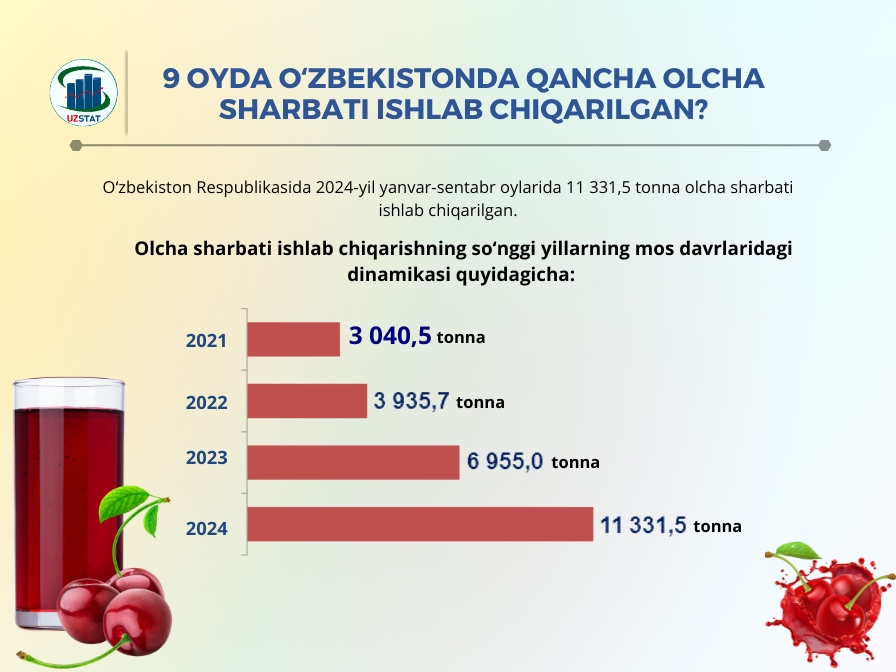 Oʻzbekiston Respublikasida 2024-yil yanvar-sentabr oylarida yirik korxonalar tomonidan 11 331,5 tonna olcha sharbati ishlab chiqarilgan.