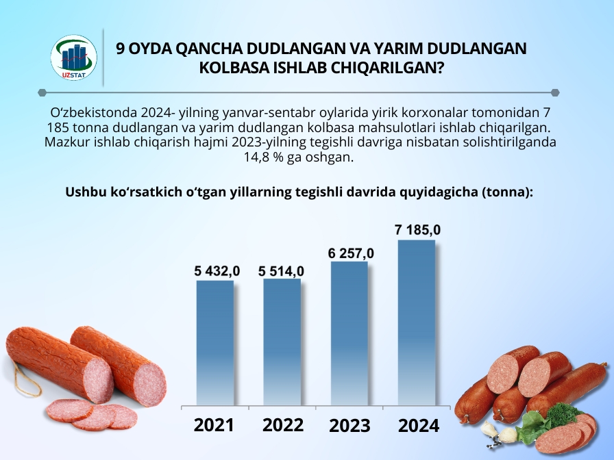 Oʻzbekistonda 2024- yilning yanvar-sentabr oylarida yirik korxonalar tomonidan 7 185 tonna dudlangan va yarim dudlangan kolbasa mahsulotlari ishlab chiqarilgan.