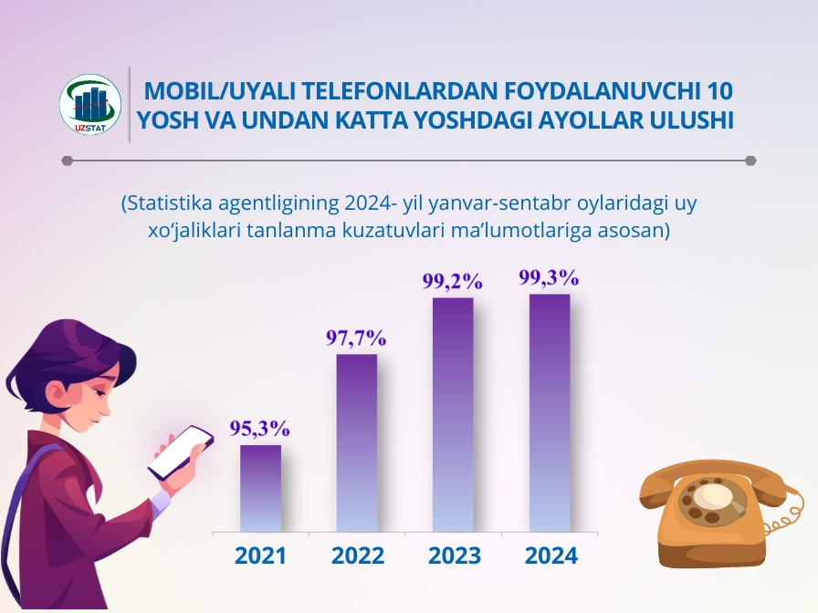 Statistika agentligining uy xo‘jaliklari tanlanma kuzatuvlari ma’lumotlariga asosan, 2024-yil yanvar- sentabr oylarida mobil/uyali telefonlardan foydalanuvchi 10 yosh va undan katta yoshdagi ayollar ulushi 99,3 % ni tashkil etgan.