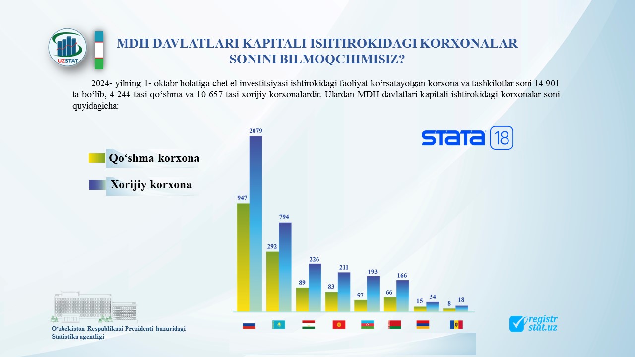 2024- yilning 1- oktabr holatiga chet el investitsiyasi ishtirokidagi faoliyat ko‘rsatayotgan korxona va tashkilotlar soni 14 901 ta bo‘lib, 4 244 tasi qo‘shma va 10 657 tasi xorijiy korxonalardir.