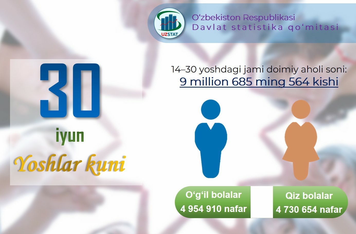 Davlat statistika qoʻmitasi jamoasi nomidan bugungi muhim sana - Yoshlar kunida barcha yoshlarga, jumladan, statistika tizimida faoliyat olib borayotgan yoshlarga mustahkam sogʻlik, bilim olish, kasb-hunar oʻrganish va izlanishdan toʻxtamaslik, eng asosiysi, ota-onangiz, oilangiz, yaqinlaringiz hamda vatanimiz ishonchini oqlab, ezgu maqsadlaringizga erishishingizda tilakdoshmiz!