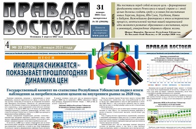 “Правда Востока” gezetasining 2021- yil 31- yanvardagi 22- sonida Davlat statistika qo‘mitasi Narxlar statistikasi bo'yicha yig'ma tahliliy axborotlarni shakllantirish bo'limi boshlig‘i Djamaldinov Javoxirbek hamda bosh mutaxassisi Natalya Dalinskayaning “O‘tgan yilgi narxlar dinamikasiga ko‘ra inflyatsiya pasayib bormoqda” nomli maqolasi chop etildi.