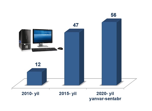 Davlat statistika qo‘mitasining ma’lumotlariga ko‘ra, 2020- yilning yanvar-sentabr holatiga, uy xo‘jaliklari tanlama kuzatuvlari ma’lumotlariga asosan 100 ta uy xo‘jaligiga to‘g‘ri keladigan shaxsiy kompyuterlar soni 56 tani tashkil etdi.