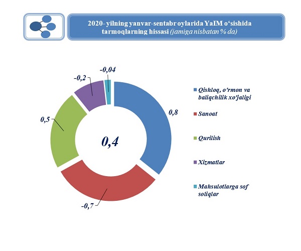 Dastlabki ma’lumotlarga koʻra, 2020- yilning 9 oy yakunlariga koʻra, Oʻzbekistonning yalpi ichki mahsuloti (YaIM) oʻtgan yilning mos davri bilan taqqoslaganda 0,4 % ga (2019- yilning 9 oyligida – 5,9 % ga) oʻsdi.