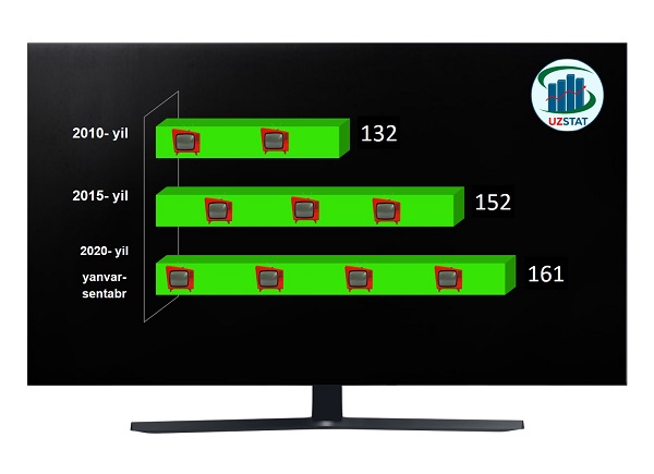 Davlat statistika qo‘mitasining ma’lumotlariga ko‘ra, 2020- yilning yanvar-sentabr oylarida, uy xo‘jaliklari tanlama kuzatuvlari ma’lumotlariga asosan 100 ta uy xo‘jaligiga to‘g‘ri keladigan televizorlar soni 161 tani tashkil etdi.
