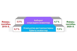 2020- yilning yanvar-sentabr oylarida, ko‘rsatilgan bozor xizmatlari umumiy hajmida aloqa va axborotlashtirish xizmatlarining ulushi 6,0 % gacha oshishi (2019-yilning yanvar-sentabrida – 5,6 %) qayd etildi.