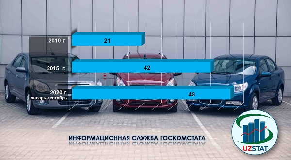 По данным Госкомстата, в январе-сентябре 2020 года согласно данным выборочных обследований домашних хозяйств, количество автомобилей на 100 домохозяйств составило 48 шт. Для справки: в 2010 году этот показатель составлял 21 шт., в 2015 году 42 шт.