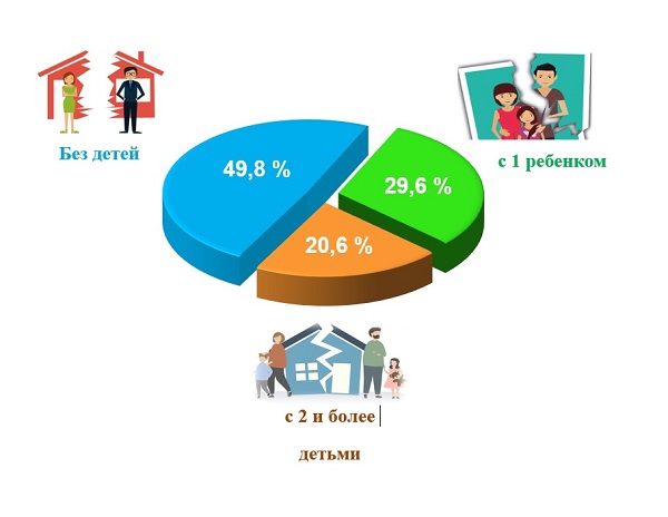 Анализ числа разводов от брака по числу детей показывает, что 49,8% от общего числа разведенных семей были бездетными, 29,6% имели одного ребенка и 20,6% имели двух и более детей.