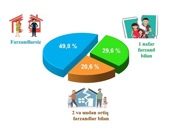 Qayd etilgan nikohdan ajralishlar sonining farzandlar soni boʻyicha tahlili shuni koʻrsatmoqdaki, jami ajrim qayd etilgan oilalarning 49,8 foizi farzandsiz, 29,6 foizida bir nafar farzand va 20,6 foizida ikki va undan ortiq nafar farzandlar boʻlgan.