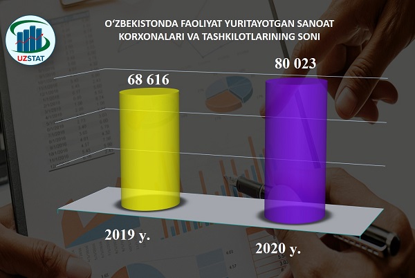 Oʻzbekistonda faoliyat yuritayotgan sanoat korxonalari va tashkilotlarining tahlili shuni koʻrsatdiki, mulkchilik shakllarini oʻzgartirish va tarmoqlarni qayta tuzishga qaratilgan islohotlar natijasida, 2020- yil 1- oktabr holatiga ularning sanoatda soni 80 023 tani tashkil etdi, bu 16,6% oʻtgan yilning shu davriga nisbatan koʻproq.