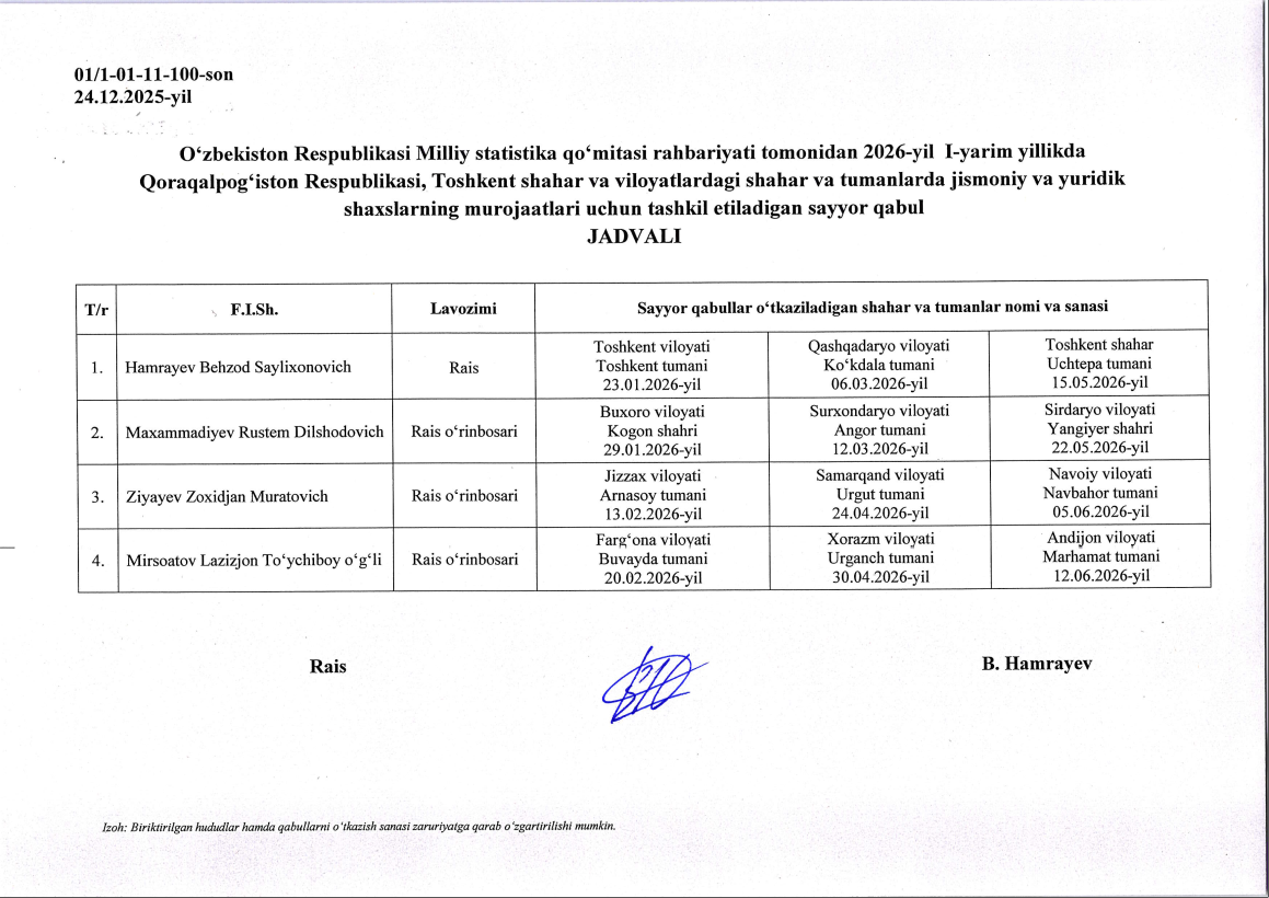 2026-yil 1-yarim yillik sayyor qabul jadvali